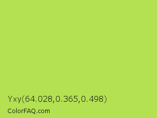 Yxy 64.028,0.365,0.498 Color is a normal lime color and the nearest color is Conifer #acdd4d. Hex code #b3e151 and RGB value is rgb(179,225,81). In RGB color space, this color is composed of 70% red, 88% green, 32% blue, In CMYK color space, this color is composed of 20% cyan, 0% magenta, 64% yellow , 12% black , In HSL color space, this color has a hue angle of 79° , 71% saturation and 60% lightness.