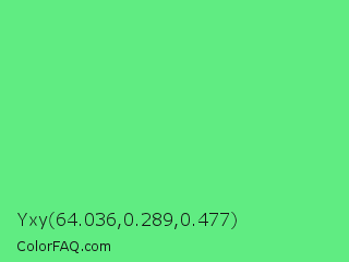 Yxy 64.036,0.289,0.477 Color is a light green color and the nearest color is Very Light Malachite Green #64e986. Hex code #60ec82 and RGB value is rgb(96,236,130). In RGB color space, this color is composed of 38% red, 93% green, 51% blue, In CMYK color space, this color is composed of 59% cyan, 0% magenta, 45% yellow , 7% black , In HSL color space, this color has a hue angle of 135° , 79% saturation and 65% lightness.
