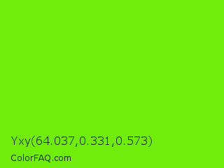 Yxy 64.037,0.331,0.573 Color is a normal green color and the nearest color is Lawn Green #7cfc00. Hex code #70ed0b and RGB value is rgb(112,237,11). In RGB color space, this color is composed of 44% red, 93% green, 4% blue, In CMYK color space, this color is composed of 53% cyan, 0% magenta, 95% yellow , 7% black , In HSL color space, this color has a hue angle of 93° , 91% saturation and 49% lightness.