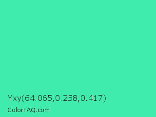 Yxy 64.065,0.258,0.417 Color is a normal green color and the nearest color is Eucalyptus #44d7a8. Hex code #40ecad and RGB value is rgb(64,236,173). In RGB color space, this color is composed of 25% red, 93% green, 68% blue, In CMYK color space, this color is composed of 73% cyan, 0% magenta, 27% yellow , 7% black , In HSL color space, this color has a hue angle of 158° , 82% saturation and 59% lightness.