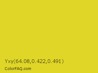 Yxy 64.08,0.422,0.491 Color is a normal yellow color and the nearest color is Sunflower #e4d422. Hex code #e0d627 and RGB value is rgb(224,214,39). In RGB color space, this color is composed of 88% red, 84% green, 15% blue, In CMYK color space, this color is composed of 0% cyan, 4% magenta, 83% yellow , 12% black , In HSL color space, this color has a hue angle of 57° , 75% saturation and 52% lightness.