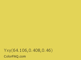 Yxy 64.106,0.408,0.46 Color is a light yellow color and the nearest color is Confetti #e9d75a. Hex code #e3d457 and RGB value is rgb(227,212,87). In RGB color space, this color is composed of 89% red, 83% green, 34% blue, In CMYK color space, this color is composed of 0% cyan, 7% magenta, 62% yellow , 11% black , In HSL color space, this color has a hue angle of 54° , 71% saturation and 62% lightness.