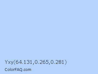 Yxy 64.131,0.265,0.281 Color is a very light blue color and the nearest color is Sail #b8e0f9. Hex code #b4d4ff and RGB value is rgb(180,212,255). In RGB color space, this color is composed of 71% red, 83% green, 100% blue, In CMYK color space, this color is composed of 29% cyan, 17% magenta, 0% yellow , 0% black , In HSL color space, this color has a hue angle of 214° , 100% saturation and 85% lightness.