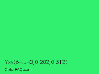 Yxy 64.143,0.282,0.512 Color is a normal green color and the nearest color is UFO Green #3cd070. Hex code #31f070 and RGB value is rgb(49,240,112). In RGB color space, this color is composed of 19% red, 94% green, 44% blue, In CMYK color space, this color is composed of 80% cyan, 0% magenta, 53% yellow , 6% black , In HSL color space, this color has a hue angle of 140° , 86% saturation and 57% lightness.