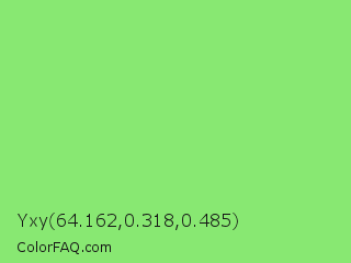 Yxy 64.162,0.318,0.485 Color is a light green color and the nearest color is Pastel Green #77dd77. Hex code #88e872 and RGB value is rgb(136,232,114). In RGB color space, this color is composed of 53% red, 91% green, 45% blue, In CMYK color space, this color is composed of 41% cyan, 0% magenta, 51% yellow , 9% black , In HSL color space, this color has a hue angle of 109° , 72% saturation and 68% lightness.