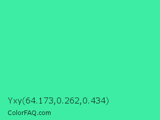 Yxy 64.173,0.262,0.434 Color is a normal green color and the nearest color is Eucalyptus #44d7a8. Hex code #3ceda3 and RGB value is rgb(60,237,163). In RGB color space, this color is composed of 24% red, 93% green, 64% blue, In CMYK color space, this color is composed of 75% cyan, 0% magenta, 31% yellow , 7% black , In HSL color space, this color has a hue angle of 155° , 83% saturation and 58% lightness.