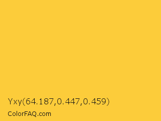 Yxy 64.187,0.447,0.459 Color is a light orange color and the nearest color is Bright Sun #fed33c. Hex code #fccc3a and RGB value is rgb(252,204,58). In RGB color space, this color is composed of 99% red, 80% green, 23% blue, In CMYK color space, this color is composed of 0% cyan, 19% magenta, 77% yellow , 1% black , In HSL color space, this color has a hue angle of 45° , 97% saturation and 61% lightness.