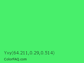 Yxy 64.211,0.29,0.514 Color is a light green color and the nearest color is UFO Green #3cd070. Hex code #48ef6b and RGB value is rgb(72,239,107). In RGB color space, this color is composed of 28% red, 94% green, 42% blue, In CMYK color space, this color is composed of 70% cyan, 0% magenta, 55% yellow , 6% black , In HSL color space, this color has a hue angle of 133° , 84% saturation and 61% lightness.