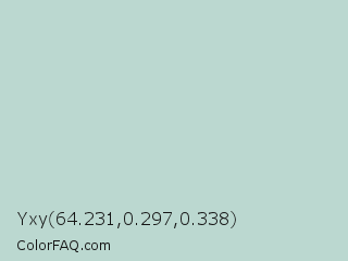 Yxy 64.231,0.297,0.338 Color is a light green color and the nearest color is Jet Stream #b5d2ce. Hex code #bbd8d0 and RGB value is rgb(187,216,208). In RGB color space, this color is composed of 73% red, 85% green, 82% blue, In CMYK color space, this color is composed of 13% cyan, 0% magenta, 4% yellow , 15% black , In HSL color space, this color has a hue angle of 163° , 27% saturation and 79% lightness.
