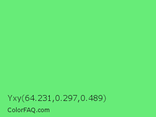 Yxy 64.231,0.297,0.489 Color is a light green color and the nearest color is Very Light Malachite Green #64e986. Hex code #67ec78 and RGB value is rgb(103,236,120). In RGB color space, this color is composed of 40% red, 93% green, 47% blue, In CMYK color space, this color is composed of 56% cyan, 0% magenta, 49% yellow , 7% black , In HSL color space, this color has a hue angle of 128° , 78% saturation and 66% lightness.