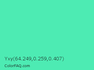 Yxy 64.249,0.259,0.407 Color is a light green color and the nearest color is Eucalyptus #44d7a8. Hex code #4debb3 and RGB value is rgb(77,235,179). In RGB color space, this color is composed of 30% red, 92% green, 70% blue, In CMYK color space, this color is composed of 67% cyan, 0% magenta, 24% yellow , 8% black , In HSL color space, this color has a hue angle of 159° , 80% saturation and 61% lightness.
