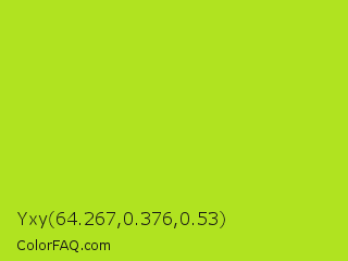 Yxy 64.267,0.376,0.53 Color is a normal lime color and the nearest color is Inch Worm #b0e313. Hex code #b0e320 and RGB value is rgb(176,227,32). In RGB color space, this color is composed of 69% red, 89% green, 13% blue, In CMYK color space, this color is composed of 22% cyan, 0% magenta, 86% yellow , 11% black , In HSL color space, this color has a hue angle of 76° , 78% saturation and 51% lightness.