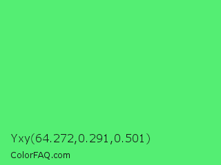 Yxy 64.272,0.291,0.501 Color is a light green color and the nearest color is Very Light Malachite Green #64e986. Hex code #54ee73 and RGB value is rgb(84,238,115). In RGB color space, this color is composed of 33% red, 93% green, 45% blue, In CMYK color space, this color is composed of 65% cyan, 0% magenta, 52% yellow , 7% black , In HSL color space, this color has a hue angle of 132° , 82% saturation and 63% lightness.