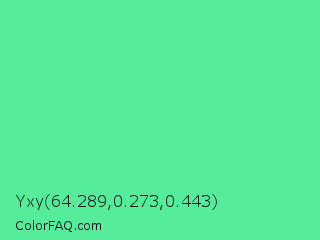 Yxy 64.289,0.273,0.443 Color is a light green color and the nearest color is Very Light Malachite Green #64e986. Hex code #55ec9b and RGB value is rgb(85,236,155). In RGB color space, this color is composed of 33% red, 93% green, 61% blue, In CMYK color space, this color is composed of 64% cyan, 0% magenta, 34% yellow , 7% black , In HSL color space, this color has a hue angle of 148° , 80% saturation and 63% lightness.