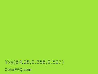 Yxy 64.28,0.356,0.527 Color is a normal green color and the nearest color is Kiwi #8ee53f. Hex code #9fe63b and RGB value is rgb(159,230,59). In RGB color space, this color is composed of 62% red, 90% green, 23% blue, In CMYK color space, this color is composed of 31% cyan, 0% magenta, 74% yellow , 10% black , In HSL color space, this color has a hue angle of 85° , 77% saturation and 57% lightness.