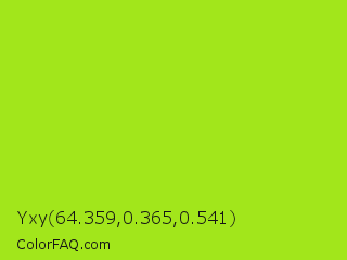 Yxy 64.359,0.365,0.541 Color is a normal green color and the nearest color is Inch Worm #b0e313. Hex code #a2e61b and RGB value is rgb(162,230,27). In RGB color space, this color is composed of 64% red, 90% green, 11% blue, In CMYK color space, this color is composed of 30% cyan, 0% magenta, 88% yellow , 10% black , In HSL color space, this color has a hue angle of 80° , 80% saturation and 50% lightness.