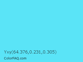 Yxy 64.376,0.231,0.305 Color is a light cyan color and the nearest color is Turquoise Blue #6cdae7. Hex code #5ae4f7 and RGB value is rgb(90,228,247). In RGB color space, this color is composed of 35% red, 89% green, 97% blue, In CMYK color space, this color is composed of 64% cyan, 8% magenta, 0% yellow , 3% black , In HSL color space, this color has a hue angle of 187° , 91% saturation and 66% lightness.