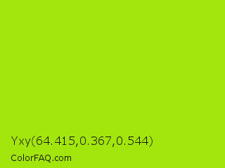 Yxy 64.415,0.367,0.544 Color is a normal lime color and the nearest color is Inch Worm #b0e313. Hex code #a3e60d and RGB value is rgb(163,230,13). In RGB color space, this color is composed of 64% red, 90% green, 5% blue, In CMYK color space, this color is composed of 29% cyan, 0% magenta, 94% yellow , 10% black , In HSL color space, this color has a hue angle of 79° , 89% saturation and 48% lightness.