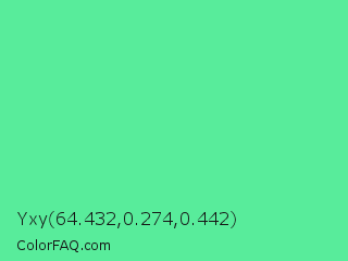 Yxy 64.432,0.274,0.442 Color is a light green color and the nearest color is Very Light Malachite Green #64e986. Hex code #58ec9b and RGB value is rgb(88,236,155). In RGB color space, this color is composed of 35% red, 93% green, 61% blue, In CMYK color space, this color is composed of 63% cyan, 0% magenta, 34% yellow , 7% black , In HSL color space, this color has a hue angle of 147° , 80% saturation and 64% lightness.