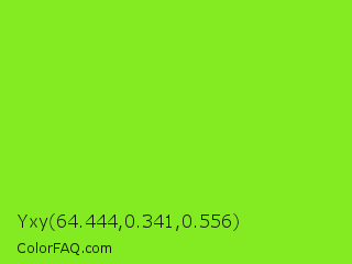 Yxy 64.444,0.341,0.556 Color is a normal green color and the nearest color is Spring Frost #87ff2a. Hex code #84eb23 and RGB value is rgb(132,235,35). In RGB color space, this color is composed of 52% red, 92% green, 14% blue, In CMYK color space, this color is composed of 44% cyan, 0% magenta, 85% yellow , 8% black , In HSL color space, this color has a hue angle of 91° , 83% saturation and 53% lightness.
