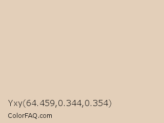 Yxy 64.459,0.344,0.354 Color is a very light orange color and the nearest color is Grain Brown #e4d5b7. Hex code #e3cfb9 and RGB value is rgb(227,207,185). In RGB color space, this color is composed of 89% red, 81% green, 73% blue, In CMYK color space, this color is composed of 0% cyan, 9% magenta, 19% yellow , 11% black , In HSL color space, this color has a hue angle of 31° , 43% saturation and 81% lightness.