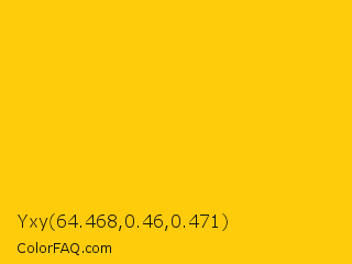 Yxy 64.468,0.46,0.471 Color is a normal yellow color and the nearest color is Mikado Yellow #ffc40c. Hex code #ffcc0b and RGB value is rgb(255,204,11). In RGB color space, this color is composed of 100% red, 80% green, 4% blue, In CMYK color space, this color is composed of 0% cyan, 20% magenta, 96% yellow , 0% black , In HSL color space, this color has a hue angle of 47° , 100% saturation and 52% lightness.