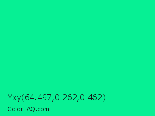 Yxy 64.497,0.262,0.462 Color is a normal green color and the nearest color is Medium Spring Green #00fa9a. Hex code #06f094 and RGB value is rgb(6,240,148). In RGB color space, this color is composed of 2% red, 94% green, 58% blue, In CMYK color space, this color is composed of 98% cyan, 0% magenta, 38% yellow , 6% black , In HSL color space, this color has a hue angle of 156° , 95% saturation and 48% lightness.