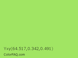 Yxy 64.517,0.342,0.491 Color is a light green color and the nearest color is Inchworm #b2ec5d. Hex code #a1e563 and RGB value is rgb(161,229,99). In RGB color space, this color is composed of 63% red, 90% green, 39% blue, In CMYK color space, this color is composed of 30% cyan, 0% magenta, 57% yellow , 10% black , In HSL color space, this color has a hue angle of 91° , 71% saturation and 64% lightness.