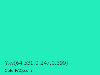 Yxy 64.531,0.247,0.399 Color is a normal cyan color and the nearest color is Turquoise PWG #30d5c8. Hex code #23edbb and RGB value is rgb(35,237,187). In RGB color space, this color is composed of 14% red, 93% green, 73% blue, In CMYK color space, this color is composed of 85% cyan, 0% magenta, 21% yellow , 7% black , In HSL color space, this color has a hue angle of 165° , 85% saturation and 53% lightness.