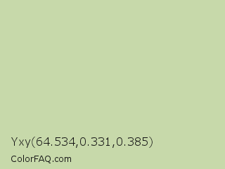 Yxy 64.534,0.331,0.385 Color is a light green color and the nearest color is Sprout #c1d7b0. Hex code #c7d9aa and RGB value is rgb(199,217,170). In RGB color space, this color is composed of 78% red, 85% green, 67% blue, In CMYK color space, this color is composed of 8% cyan, 0% magenta, 22% yellow , 15% black , In HSL color space, this color has a hue angle of 83° , 38% saturation and 76% lightness.