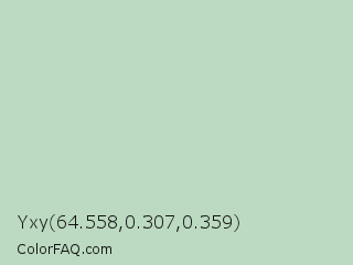 Yxy 64.558,0.307,0.359 Color is a light green color and the nearest color is Surf #bbd7c1. Hex code #bbdac1 and RGB value is rgb(187,218,193). In RGB color space, this color is composed of 73% red, 85% green, 76% blue, In CMYK color space, this color is composed of 14% cyan, 0% magenta, 11% yellow , 15% black , In HSL color space, this color has a hue angle of 132° , 30% saturation and 79% lightness.