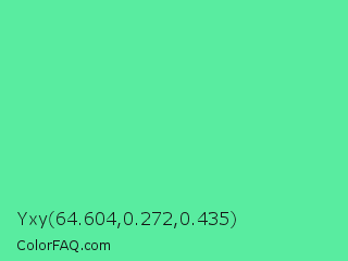 Yxy 64.604,0.272,0.435 Color is a light green color and the nearest color is Medium Aquamarine #66ddaa. Hex code #59eca0 and RGB value is rgb(89,236,160). In RGB color space, this color is composed of 35% red, 93% green, 63% blue, In CMYK color space, this color is composed of 62% cyan, 0% magenta, 32% yellow , 7% black , In HSL color space, this color has a hue angle of 149° , 79% saturation and 64% lightness.
