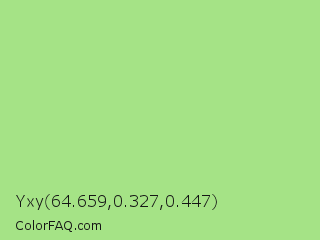 Yxy 64.659,0.327,0.447 Color is a light green color and the nearest color is Feijoa #9fdd8c. Hex code #a5e386 and RGB value is rgb(165,227,134). In RGB color space, this color is composed of 65% red, 89% green, 53% blue, In CMYK color space, this color is composed of 27% cyan, 0% magenta, 41% yellow , 11% black , In HSL color space, this color has a hue angle of 100° , 62% saturation and 71% lightness.