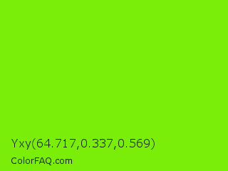 Yxy 64.717,0.337,0.569 Color is a normal green color and the nearest color is Lawn Green #7cfc00. Hex code #7aed08 and RGB value is rgb(122,237,8). In RGB color space, this color is composed of 48% red, 93% green, 3% blue, In CMYK color space, this color is composed of 49% cyan, 0% magenta, 97% yellow , 7% black , In HSL color space, this color has a hue angle of 90° , 93% saturation and 48% lightness.