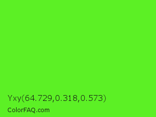 Yxy 64.729,0.318,0.573 Color is a normal green color and the nearest color is Bright Green #66ff00. Hex code #5cf025 and RGB value is rgb(92,240,37). In RGB color space, this color is composed of 36% red, 94% green, 15% blue, In CMYK color space, this color is composed of 62% cyan, 0% magenta, 85% yellow , 6% black , In HSL color space, this color has a hue angle of 104° , 87% saturation and 54% lightness.