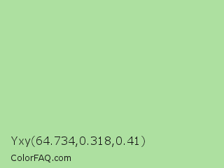 Yxy 64.734,0.318,0.41 Color is a light green color and the nearest color is Granny Smith Apple #a8e4a0. Hex code #ade0a0 and RGB value is rgb(173,224,160). In RGB color space, this color is composed of 68% red, 88% green, 63% blue, In CMYK color space, this color is composed of 23% cyan, 0% magenta, 29% yellow , 12% black , In HSL color space, this color has a hue angle of 108° , 51% saturation and 75% lightness.