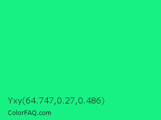 Yxy 64.747,0.27,0.486 Color is a normal green color and the nearest color is Spring Green #00ff7f. Hex code #17f184 and RGB value is rgb(23,241,132). In RGB color space, this color is composed of 9% red, 95% green, 52% blue, In CMYK color space, this color is composed of 90% cyan, 0% magenta, 45% yellow , 5% black , In HSL color space, this color has a hue angle of 150° , 89% saturation and 52% lightness.