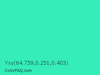 Yxy 64.759,0.251,0.403 Color is a normal green color and the nearest color is Turquoise PWG #30d5c8. Hex code #34edb8 and RGB value is rgb(52,237,184). In RGB color space, this color is composed of 20% red, 93% green, 72% blue, In CMYK color space, this color is composed of 78% cyan, 0% magenta, 22% yellow , 7% black , In HSL color space, this color has a hue angle of 163° , 84% saturation and 57% lightness.