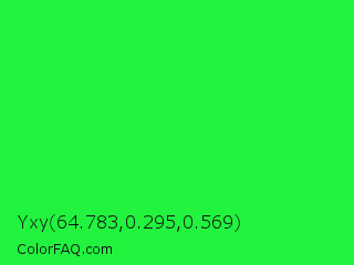 Yxy 64.783,0.295,0.569 Color is a normal green color and the nearest color is Malachite #0bda51. Hex code #21f33f and RGB value is rgb(33,243,63). In RGB color space, this color is composed of 13% red, 95% green, 25% blue, In CMYK color space, this color is composed of 86% cyan, 0% magenta, 74% yellow , 5% black , In HSL color space, this color has a hue angle of 129° , 90% saturation and 54% lightness.