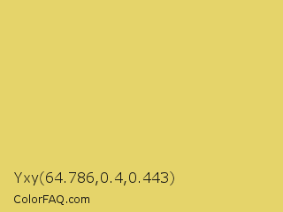 Yxy 64.786,0.4,0.443 Color is a light yellow color and the nearest color is Hansa Yellow #e9d66b. Hex code #e5d46a and RGB value is rgb(229,212,106). In RGB color space, this color is composed of 90% red, 83% green, 42% blue, In CMYK color space, this color is composed of 0% cyan, 7% magenta, 54% yellow , 10% black , In HSL color space, this color has a hue angle of 52° , 70% saturation and 66% lightness.