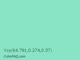 Yxy 64.791,0.274,0.37 Color is a light green color and the nearest color is Pearl Aqua #88d8c0. Hex code #88e4c4 and RGB value is rgb(136,228,196). In RGB color space, this color is composed of 53% red, 89% green, 77% blue, In CMYK color space, this color is composed of 40% cyan, 0% magenta, 14% yellow , 11% black , In HSL color space, this color has a hue angle of 159° , 63% saturation and 71% lightness.