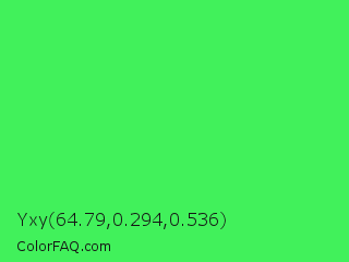 Yxy 64.79,0.294,0.536 Color is a normal green color and the nearest color is UFO Green #3cd070. Hex code #41f15b and RGB value is rgb(65,241,91). In RGB color space, this color is composed of 25% red, 95% green, 36% blue, In CMYK color space, this color is composed of 73% cyan, 0% magenta, 62% yellow , 5% black , In HSL color space, this color has a hue angle of 129° , 86% saturation and 60% lightness.