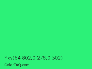 Yxy 64.802,0.278,0.502 Color is a normal green color and the nearest color is UFO Green #3cd070. Hex code #2cf178 and RGB value is rgb(44,241,120). In RGB color space, this color is composed of 17% red, 95% green, 47% blue, In CMYK color space, this color is composed of 82% cyan, 0% magenta, 50% yellow , 5% black , In HSL color space, this color has a hue angle of 143° , 88% saturation and 56% lightness.