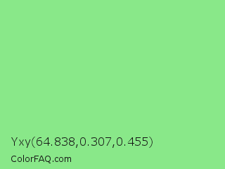 Yxy 64.838,0.307,0.455 Color is a light green color and the nearest color is Light Green #90ee90. Hex code #89e889 and RGB value is rgb(137,232,137). In RGB color space, this color is composed of 54% red, 91% green, 54% blue, In CMYK color space, this color is composed of 41% cyan, 0% magenta, 41% yellow , 9% black , In HSL color space, this color has a hue angle of 120° , 67% saturation and 72% lightness.