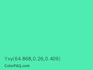 Yxy 64.868,0.26,0.409 Color is a light green color and the nearest color is Eucalyptus #44d7a8. Hex code #4fecb2 and RGB value is rgb(79,236,178). In RGB color space, this color is composed of 31% red, 93% green, 70% blue, In CMYK color space, this color is composed of 67% cyan, 0% magenta, 25% yellow , 7% black , In HSL color space, this color has a hue angle of 158° , 81% saturation and 62% lightness.