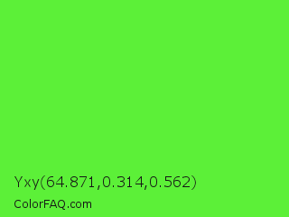 Yxy 64.871,0.314,0.562 Color is a normal green color and the nearest color is Spring Frost #87ff2a. Hex code #5cf038 and RGB value is rgb(92,240,56). In RGB color space, this color is composed of 36% red, 94% green, 22% blue, In CMYK color space, this color is composed of 62% cyan, 0% magenta, 77% yellow , 6% black , In HSL color space, this color has a hue angle of 108° , 86% saturation and 58% lightness.