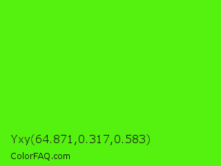 Yxy 64.871,0.317,0.583 Color is a normal green color and the nearest color is Chlorophyll Green #4aff00. Hex code #55f10f and RGB value is rgb(85,241,15). In RGB color space, this color is composed of 33% red, 95% green, 6% blue, In CMYK color space, this color is composed of 65% cyan, 0% magenta, 94% yellow , 5% black , In HSL color space, this color has a hue angle of 101° , 89% saturation and 50% lightness.