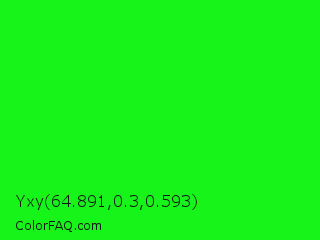 Yxy 64.891,0.3,0.593 Color is a normal green color and the nearest color is Green #00ff00. Hex code #16f419 and RGB value is rgb(22,244,25). In RGB color space, this color is composed of 9% red, 96% green, 10% blue, In CMYK color space, this color is composed of 91% cyan, 0% magenta, 90% yellow , 4% black , In HSL color space, this color has a hue angle of 121° , 91% saturation and 52% lightness.