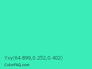 Yxy 64.899,0.252,0.402 Color is a normal green color and the nearest color is Turquoise #40e0d0. Hex code #3aedb8 and RGB value is rgb(58,237,184). In RGB color space, this color is composed of 23% red, 93% green, 72% blue, In CMYK color space, this color is composed of 76% cyan, 0% magenta, 22% yellow , 7% black , In HSL color space, this color has a hue angle of 162° , 83% saturation and 58% lightness.