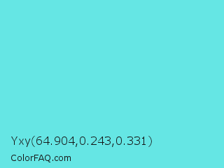 Yxy 64.904,0.243,0.331 Color is a light cyan color and the nearest color is Turquoise Blue #6cdae7. Hex code #65e6e4 and RGB value is rgb(101,230,228). In RGB color space, this color is composed of 40% red, 90% green, 89% blue, In CMYK color space, this color is composed of 56% cyan, 0% magenta, 1% yellow , 10% black , In HSL color space, this color has a hue angle of 179° , 72% saturation and 65% lightness.